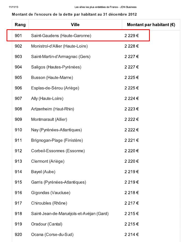 SAINT-GAUDENS : 11.698 habitants dette : 26,072 Millions d'euros annuité 2.315.000 € soit dette / habitants : 2.229 €