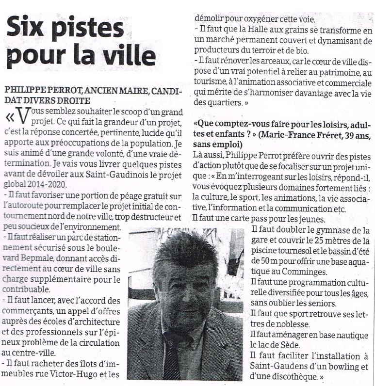 20/02/2014 10:08" Notre programme pour Saint-Gaudens n'a pas à être dissimulé aux citoyens, ce n'est pas un emballage de cadeau surprise que l'on apporte pour une fête ou un anniversaire, c'est un projet précis et visionnaire, réfléchi et préparé depuis de longs mois en concertation avec des équipes compétentes. Nous nous devons de le présenter assez tôt devant les électeurs afin que ceux-ci puissent en prendre la pleine mesure en nous demandant des précisions s'ils le désirent. "